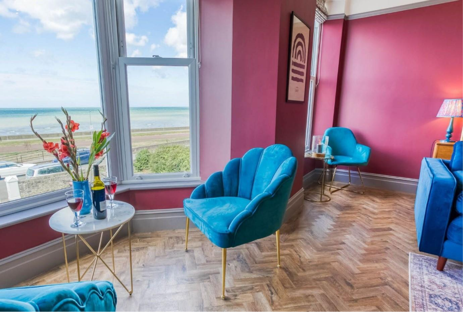 Just along the coast sits Claremont, a soft pink Victorian townhouse overlooking the promenade at Llanfairfechan. The colour alone could easily pass for raspberry sorbet, and inside the house continues the theme with playful interiors and sea views stretching across the Irish Sea towards Puffin Island.